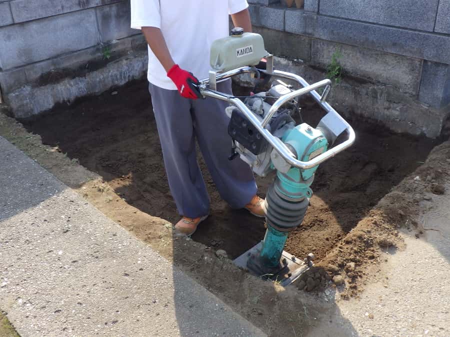 すべて取り外したあとは、基礎工事から行います。しっかりと転圧して、地盤を固めます。