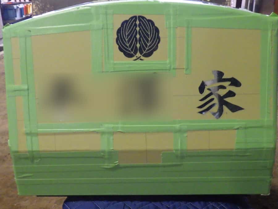 棹石正面に、家紋と家名の彫刻を行います。石の表面にゴムシートを貼って彫刻する部分を切り抜き、いわゆる「ゴム切り」の作業が完了したところです。ここに家紋を入れる点はお客様のご希望でした。