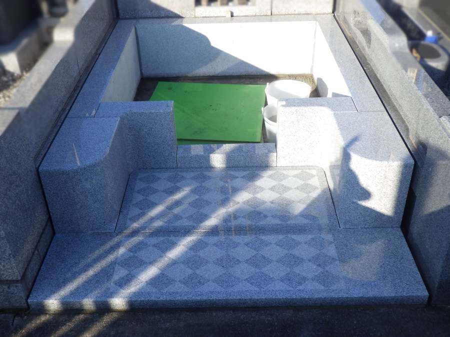 外柵が仕上がり、カロートも設置できました。カロート周りは砕石を入れて、カロートの底は棚板を敷きました。