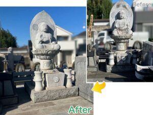 こちらはお墓の右手です。古い石塔を撤去して空いた場所に、お写真左側のお地蔵様と石塔を移設したいとご希望でした。また、草が生えないよう防草工事もしてほしいとご依頼をいただいて、移設とあわせて工事をさせていただくことになりました。