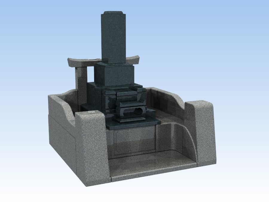 お墓については和型墓石をご希望で、高さも低すぎず、隣のお墓と同じくらいのバランスにしたいというご要望もいただきました。デザインは、曲線を使った柔らかい雰囲気のお墓にしたいとのことでしたので、そのご希望に沿って図面を作成してご提案しました。石種は、石塔がインド産のM1H、外柵はアーバングレーの組み合わせです。