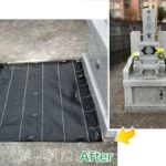 傾いた墓石を一旦撤去し、コンクリートを打って地盤を強化した上に墓石を据え直しました。